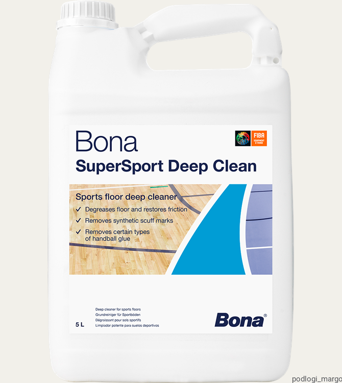 Bona SuperSport Deep Clean jest przeznaczony do okazionalnego mycia podłóg sportowych w celu usunięcia czarnych śladów po podeszwach, kleju do piłki ręcznej oraz tłuszczu i innych zanieczyszczeń powodujących że powierzchnia staje się śliska.
