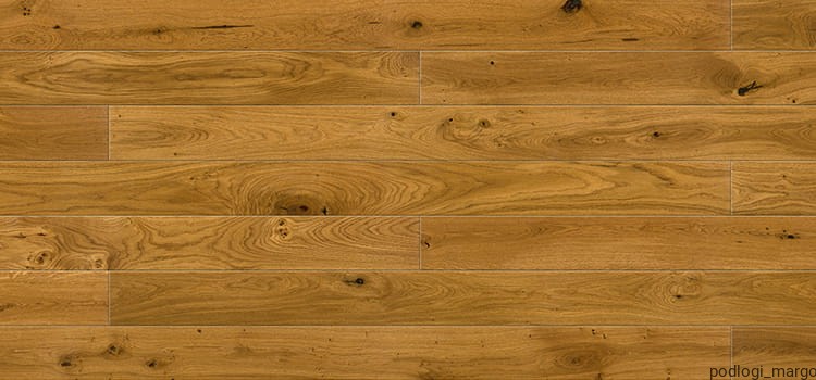 Jednopasmowa podłoga z dębu, pokryta lakierem matowym. Złotawy kolor odzwierciedla stare dębowe dechy. Dodatkowo krawędzie podłogi fazowane z czterech stron.