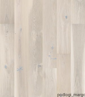 Szeroka, jednopasmowa podłoga dębowa o białym barwieniu. Deski uszlachetnione szczotkowaniem i zabezpieczone lakierem matowym. Dwustronne fazowanie optycznie wydłuża deskę i podkreśla jej naturalny wygląd.