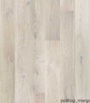 Szeroka, jednopasmowa podłoga dębowa w odcieniach bieli, wykończona olejem naturalnym. Struktura drewna podkreślona szczotkowaniem. Dwustronne fazowanie optycznie wydłuża deskę i podkreśla jej naturalny wygląd.