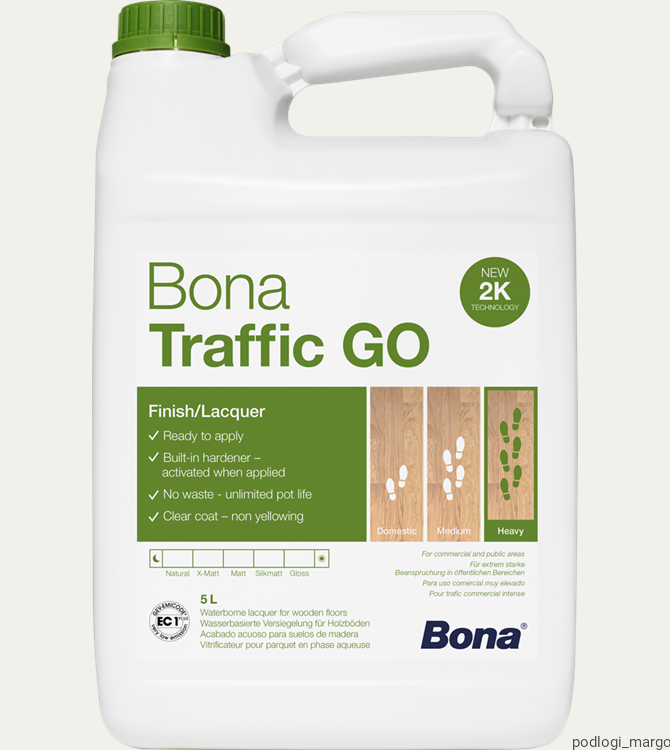 Dzięki nowej generacji technologii utwardzania 2K, Bona Traffic GO łączy w sobie prostotę i wydajność lakieru 1K z trwałością i wydajnością prawdziwego produktu 2K. Innowacyjny Bona Traffic GO z wbudowanym utwardzaczem jest gotowy do użycia prosto z opakowania i zapewnia bezpieczniejszą aplikację, i jednocześnie zapewnia wysoki poziom trwałości. Bona Traffic GO jest na tyle wszechstronny, że może być stosowany zarówno w obszarach komercyjnych, jak i domowych, ale szczególnie nadaje się do miejsc o dużym natężeniu ruchu pieszego.